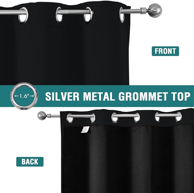 - SET DETAILS: Set of 2 total blackout curtain panels per package. Each lined curtain measures 38 inch wide by 63 inch long with 6 silver metal grommets (1.6 inch inner diameter) on top, easy to install and slide.