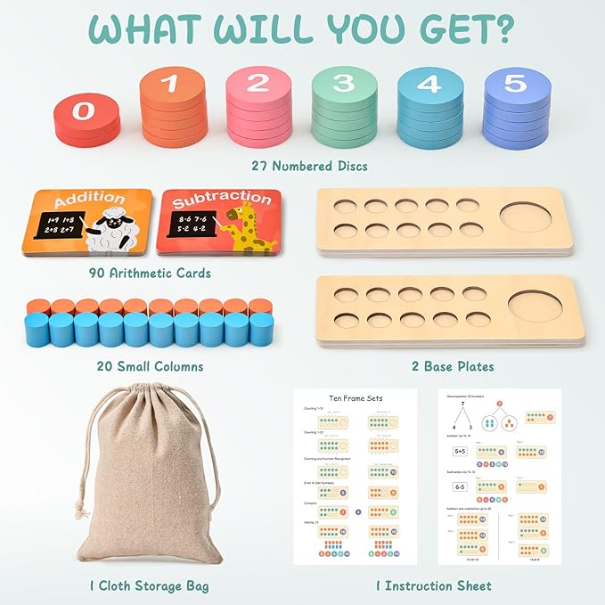 - 1 to 20 Montessori Math Toys: Our ten frame set comes with a rich variety of accessories. It includes two Ten Frame boards, two sets of number discs ranging from 0 to 10, one set of wooden pegs, one set of arithmetic symbols, 90+ addition and subtraction flashcards, and a storage bag. These accessories can teach toddlers mathematics in a progressive manner, helping them understand and learn addition and subtraction of numbers from 1 to 20. It is suitable for use at home or in the classroom