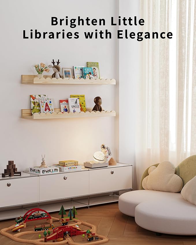 Nursery Book Shelves, 4-Pack Wood Floating Shelves for Wall Kids, Scalloped Shelves, Wall Book Shelves for Bedroom Kids, Toddler Room, Baby Room, Nursery Decor (Wood, 23 Inches)