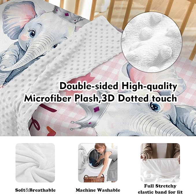 Personalized Nursery Crib Bedding Set: Custom Name Pink Checkered 5 Piece Baby Crib Sets with Cute Elephant Pattern - Toddler Double Layer Blanket Set, Comfortable Crib Bed Sheets for Baby Grils