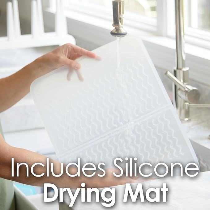 - ✅ BEAUTIFUL SPACE SAVING DESIGN! Great for air drying everyday items like plastic bags, cups, baby bottles, tumblers and most items which are not dishwasher safe. The compact drying rack sits near the back of your counter, leaving the front counter area available for use. The silicone drying mat keeps moisture off of your counter–the clear frosted mat works with ALL countertop colors and folds in half for easy storage.