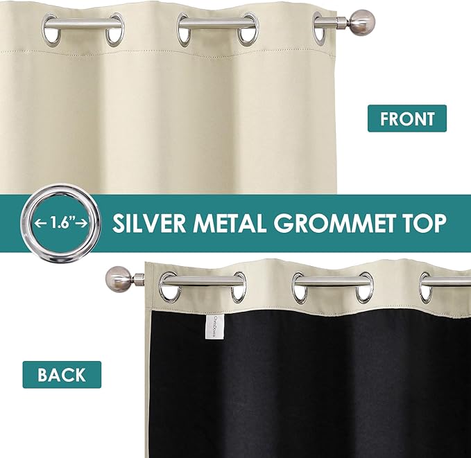- SET DETAILS: Set of 2 total blackout curtain panels per package. Each lined curtain measures 52 inch wide by 45 inch long with 8 silver metal grommets (1.6 inch inner diameter) on top, easy to install and slide.