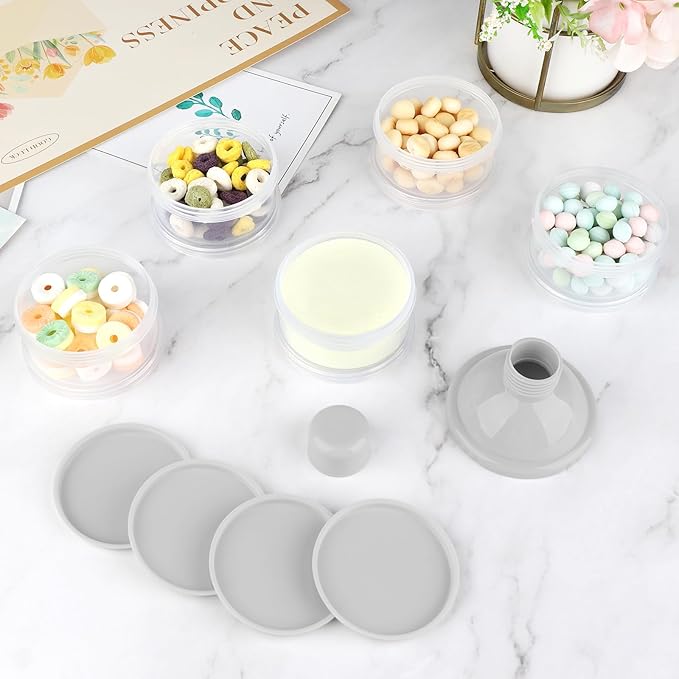 Capacity - 5 layers design. You can put quantity of baby formula on each layer. A total of 5 layers of pre measured milk powder or food can be placed. Very pratical formula container for on the go.