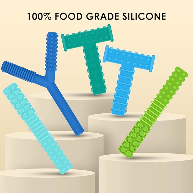 - FUN TEETHING TOYS: Our sensory teething toys set includes 2 pcs T shaped, 1pcs Y shaped sensory chewy toys and 2 pcs teething tubes, helps keep your kids from chewing on fingers, pencils, hands, clothes, hairs, etc. Reducing stress, anxiety especially when they need to soothe, calm, or focus