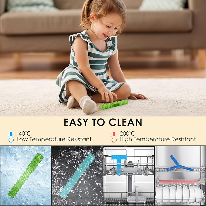 - EASY TO CLEAN: very easy to clean, just wash the sensory chewing toys with soapy water, or wash it with dishwasher. Our teethers for babies can be sterilized by boiling water, steam sterilizer and sunlight. -40β to 200β Temperature resistant, we suggest cleaning it before first use and after each use