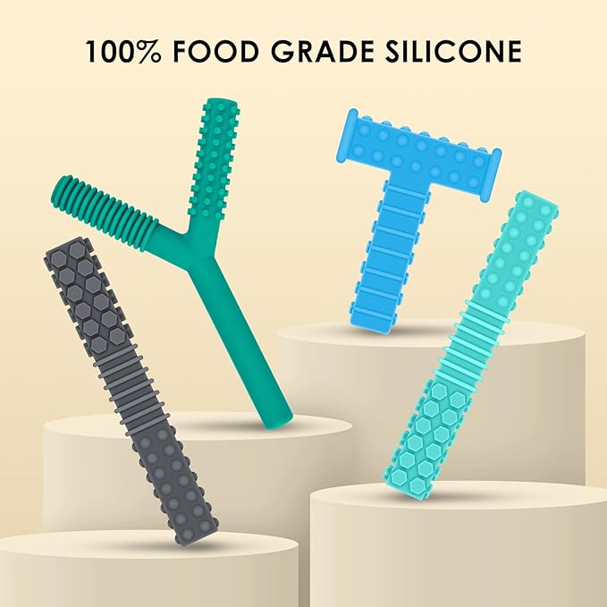 - FUN TEETHING TOYS: Our sensory teething toys set includes 1 pcs T shaped, 1 pcs Y shaped sensory chewy toys and 2 pcs teething tubes, helps keep your kids from chewing on fingers, pencils, hands, clothes, hairs, etc. Reducing stress, anxiety especially when they need to soothe, calm, or focus