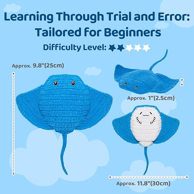 Mewaii Microwavable Heatable Manta Ray Crochet Kit for Beginners Level 2 with 40% Extra Eco-Friendly Pre-Started Easy Yarn, Step-by-Step Video Tutorials for Adults and Kids