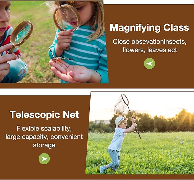 【All-in-One Adventure Kit】 This comprehensive set includes a magnifying glass for close-up observations, an extendable net, tweezers, a grabber, a cage, a container, cards, and a portable bag. It has everything kids need to dive into exciting outdoor adventures.