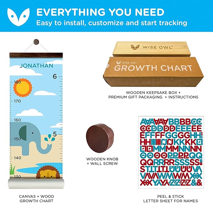 WISE OWL Personalized Growth Chart for Kids - Height Wall Chart for Boys with Peel & Stick Letters for Name - Hanging Canvas Wall Measurement Height Tracker for Baby Gift (Safari)