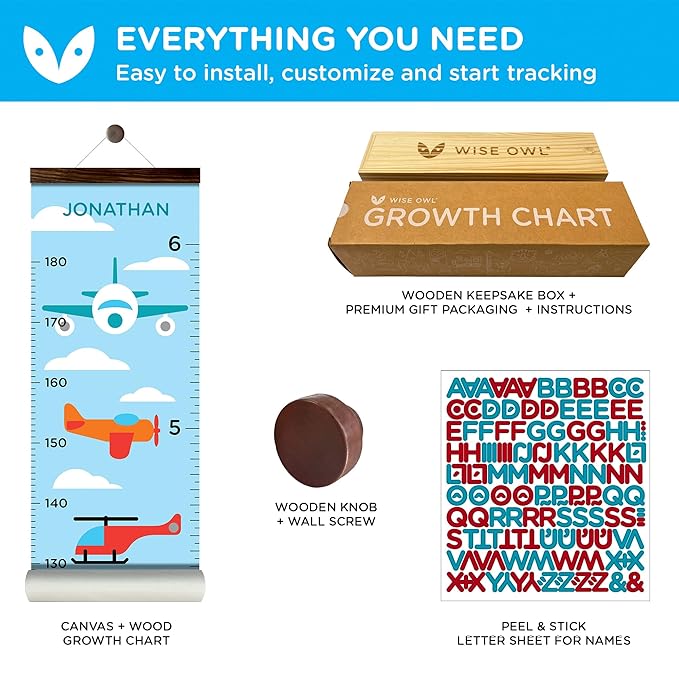 WISE OWL Personalized Growth Chart for Kids - Height Wall Chart for Boys with Peel & Stick Letters for Name - Hanging Canvas Wall Measurement Height Tracker for Baby Gift (Vehicles)
