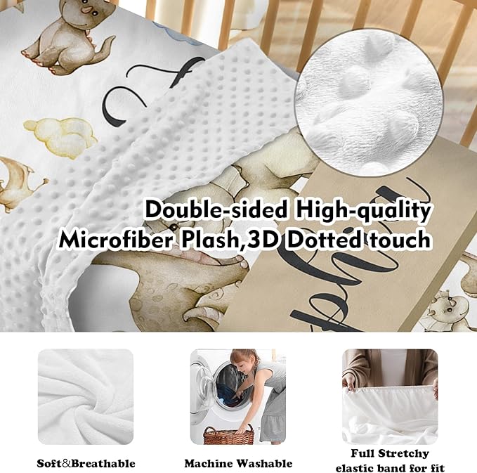 Personalized Baby Crib Bedding Set, 5-Piece Cute Dinosaur Baby Crib Sets with Custom Name, Toddler Double Layer Blanket Fitted Sheets Changing Pad Cover Rug Wall Art Set, Charming Nursery Decor
