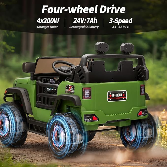 - POWERFUL PERFORMANCE: This 24V big kids ride-on car with remote features strong 4x200W motors. The switchable 2WD/4WD mode ensures it's perfect for any terrain, providing a thrilling and fun riding experience.