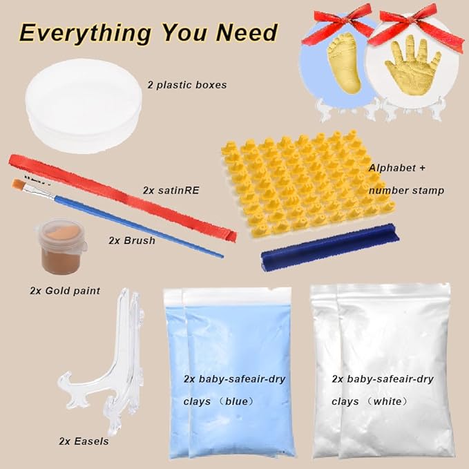 - Baby Handprint Ornament kit: Includes 4 packs of clay for footprint or hand mold, (2 white and 2 blue,makes 2 keepsakes of 4" diameter, or 1 larger keepsake), 2 Plastic Cutting Rings of 4" diameter, 2 Plastic Easels, 2 Plastic Straw Hole Punch, Ribbons in Red.paints, and paintbrushes.Hand print ornament kits for babies, baby footprint ornament kit, baby first Christmas ornament, keepsake ornaments.