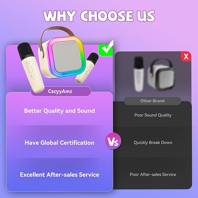 - 【Take the Party Anywhere】10H Playback(USB-C rechargeable) beats 90% of mini karaoke machines.Small and light design is convenient for you to take anywhere.And you can safely let your children play mini karaoke machine by themselves(meets toy safety standards).We promise provide replacement for any product damage within 5 years.