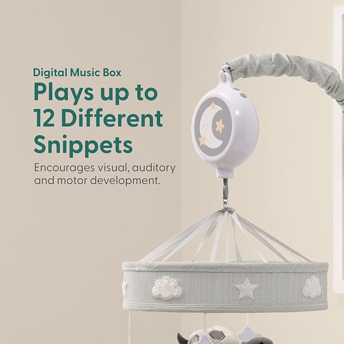- Versatile Melodies: With a digital music box that offers 12 different lullabies, you can easily change the song to suit your baby’s mood. The handy volume control lets you keep it soft or a little louder.