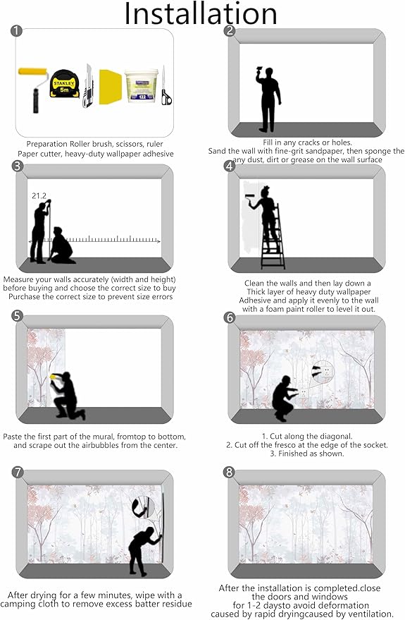 Installation Steps1. Fill in any cracks or holes and clean the surface of the wall of dust, dirt and grease.2. Apply heavy-duty wallpaper paste to the wall, not the mural.3. Mark the position of each strip of wallpaper with a spirit level.4. Align the pattern and slide it into place.5. Scrape the bubbles with a spatula.6. Let it dry for a couple of minutes and it's ready to go!