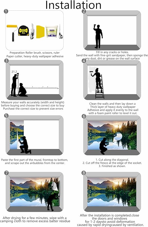 - Installation Steps1. Fill in any cracks or holes and clean the surface of the wall of dust, dirt and grease.2. Apply heavy-duty wallpaper paste to the wall, not the mural.3. Mark the position of each strip of wallpaper with a spirit level.4. Align the pattern and slide it into place.5. Scrape the bubbles with a spatula.6. Let it dry for a couple of minutes and it's ready to go!