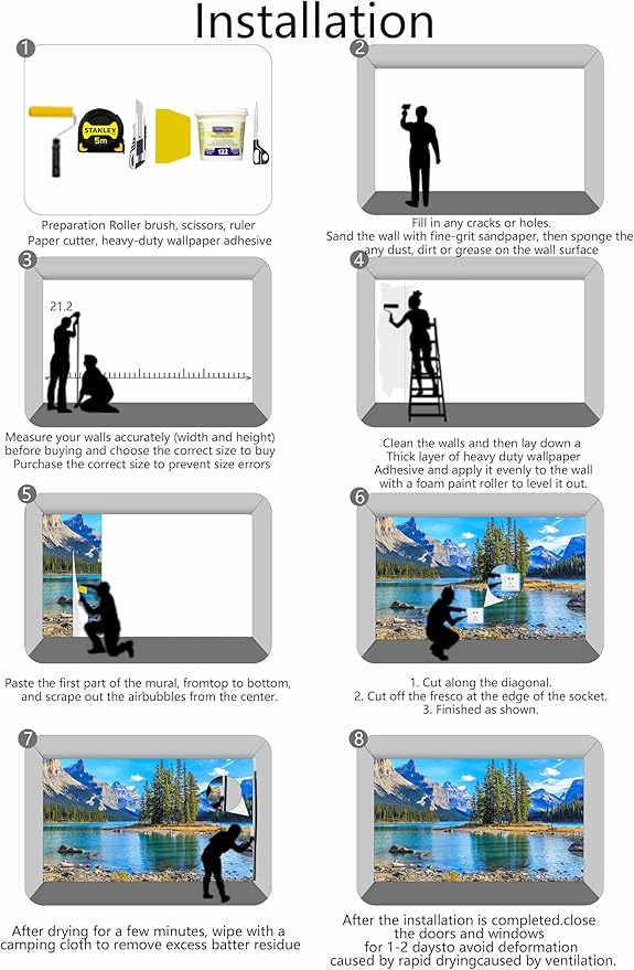 - Installation Steps1. Fill in any cracks or holes and clean the surface of the wall of dust, dirt and grease.2. Apply heavy-duty wallpaper paste to the wall, not the mural.3. Mark the position of each strip of wallpaper with a spirit level.4. Align the pattern and slide it into place.5. Scrape the bubbles with a spatula.6. Let it dry for a couple of minutes and it's ready to go!