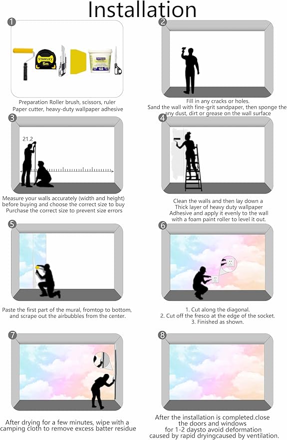 - Installation Steps1. Fill in any cracks or holes and clean the surface of the wall of dust, dirt and grease.2. Apply heavy-duty wallpaper paste to the wall, not the mural.3. Mark the position of each strip of wallpaper with a spirit level.4. Align the pattern and slide it into place.5. Scrape the bubbles with a spatula.6. Let it dry for a couple of minutes and it's ready to go!