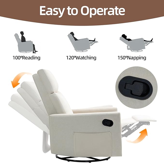 - 【Swivel Rocking Chair Nursery】 Our swivel glider recliner offers a smooth and gentle 360° swivel, and features a 30° rocking back and forth motion to help you or baby fall asleep better and faster.The backrest can be tilted from 95 degrees to 160 degrees, Footrest adjustment angle is 0-90°, to meet the needs of different scenes and you can fully relax in this nursery glider chair.