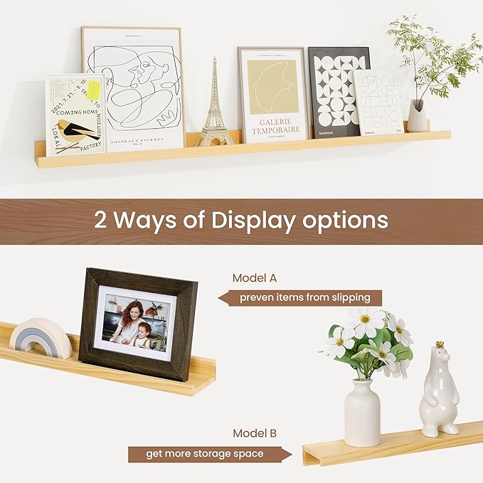 - Multi-Functional Picture Ledge: Get creative and find more functions other than the long picture ledge shelf. Fun Memories solid pine wood storage ledge shelves can act as a kids' bookshelf, display shelf for collectibles figures, spice racks in the kitchen, and more