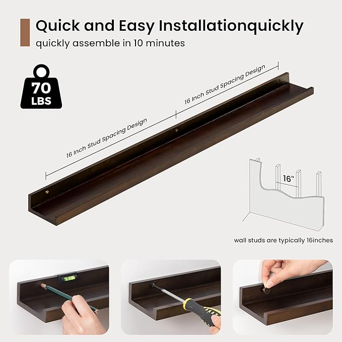 - Easy to Install: Fun Memories fully assembled solid pine wood picture ledge shelf set of 2 comes with the pre-drilled holes and necessary hardware including a mini level to make installation a breeze. The floating design creates a seamless, streamlined look, adding a touch of modern sophistication to your interior. If you have any questions about our products, please feel free to contact us