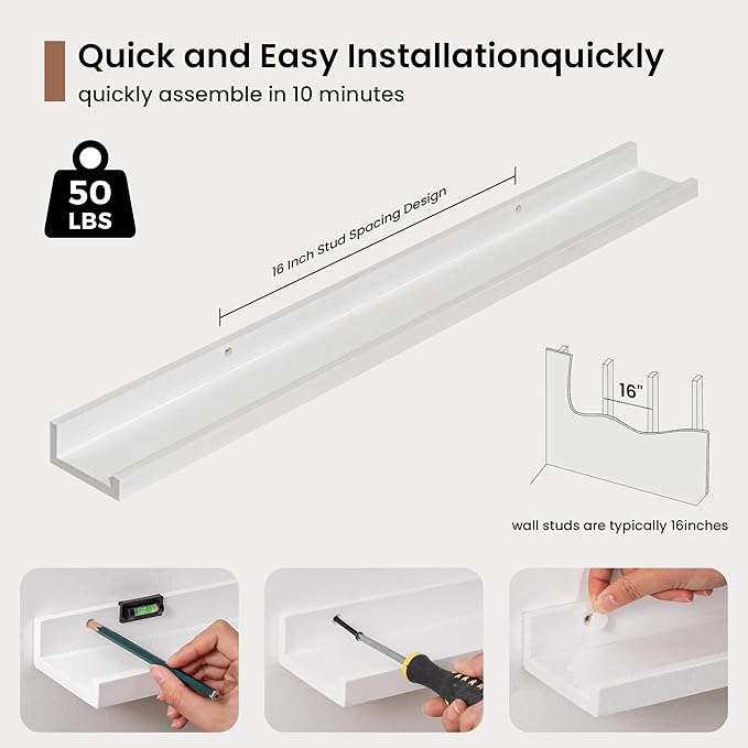 - 3.5" Floating Picture Ledge: Anti-Slip Narrow Design-3.5" ultra-narrow depth holds frames/plants without sliding, even on angled walls. Stud-Mounted Stability-16" pre-drilled holes match standard studs (hardware incl.) for wobble-free install. Clutter-Free Aesthetic-Clean lines blend with farmhouse/Scandinavian decor, focusing on your treasures