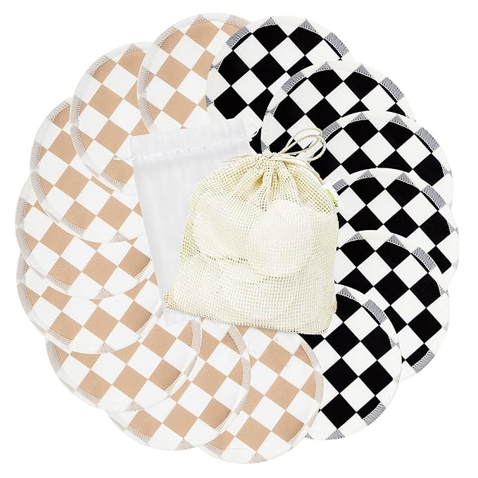 wegreeco Nursing Breast Pads (14 Pack) + Laundry Bag & Travel Storage Bag, 4.7 inch Option - Washable & Reusable Breastfeeding Nursing Pads (Light Coffee, Black Checkerboard, Large, Plain Shape)