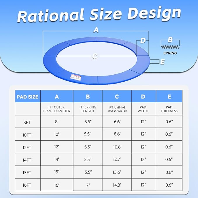 • Universal Size: KENSONE trampoline replacement pad is made for universal use, fitted with most 8/10/12/14/15/16FT trampoline frame in the market. The pad is not stretchable, please carefully measure the size of your trampoline frame before purchasing to avoid size mismatch. We have presented detailed product size data in the product pictures for your reference
