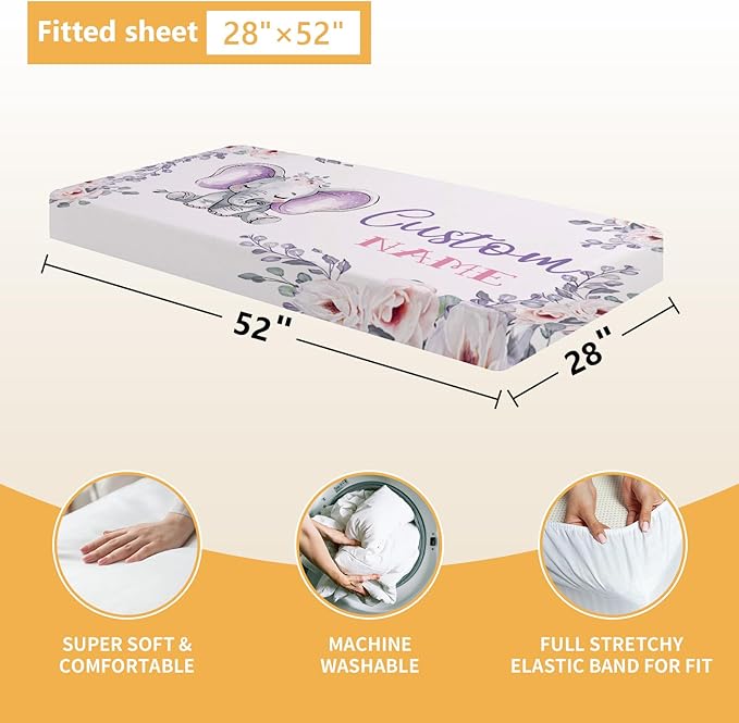 Personalized Baby Crib Bedding Set, 5 Pcs Custom Name Nursery Bedding Set, Purple Elephants Baby Bedding Set for Girls Boys, Double Layer Baby Crib Sets, Customized Gifts for Toddlers Infants