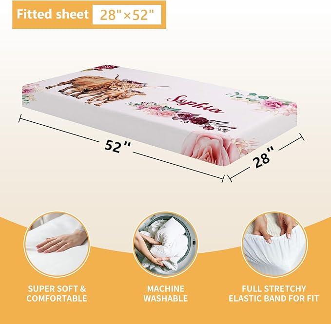Custom Baby Crib Bedding Set, 5 Pcs Personalized Name Baby Crib Sets for Infant Toddler, Purple Highland Cow Nursery Bedding Set for Baby Girls, Double Layer Baby Bedding Sets Customized Gifts