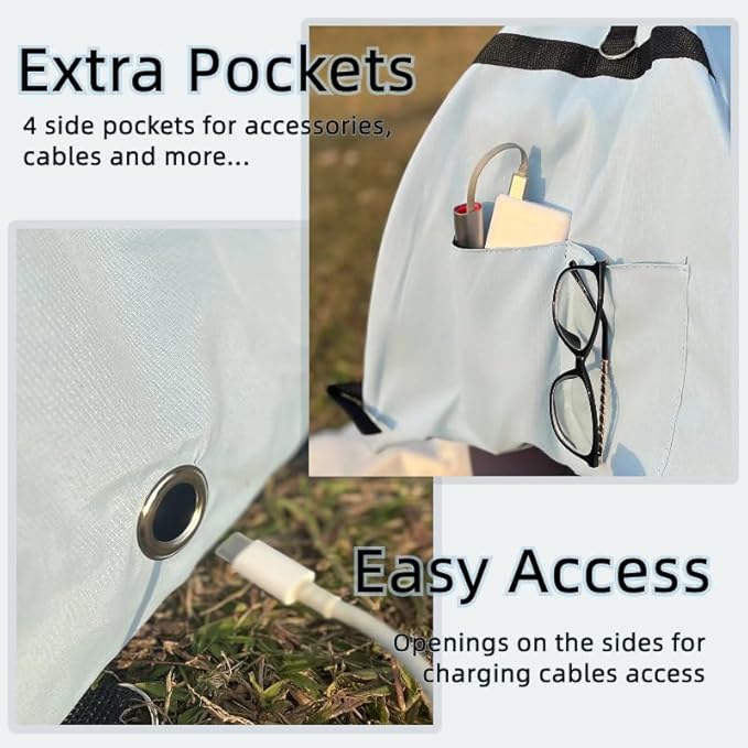 - Practical Design: The tent features side pockets for storing personal items such as your phone, e-reader, and headphones. Additionally, it has a designated opening at the back that allows charging cables to pass through, ensuring your devices stay powered while you work