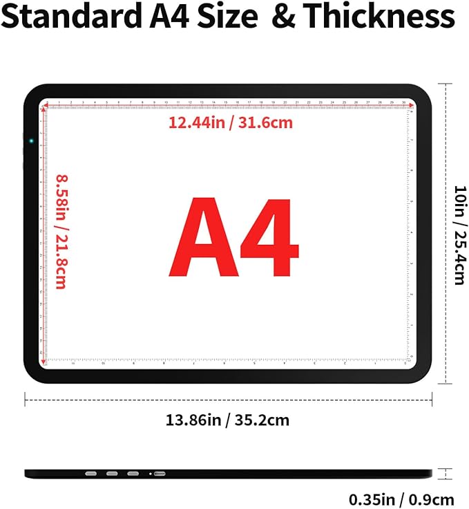 - 【Good for Your Eyes】The Tracking light box maximum brightness up to 9000LUX,Meet your various uses.Our light source is both soft and uniform, effectively safeguarding your eyes from potential harm. This A4 light table is entirely free of luminous spots or strobing effects. Thanks to our advanced eyesight - protecting technology, you can use the tracing light for extended periods without any adverse impact on your eyes