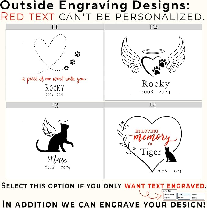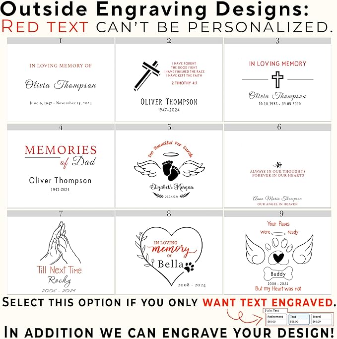 - Customized: create your own memory box by choosing one of the designs we offer and adding a name and date. We’ll use the font style showcased in the photos. The inside lid can also be engraved with your text in the different fonts we offer