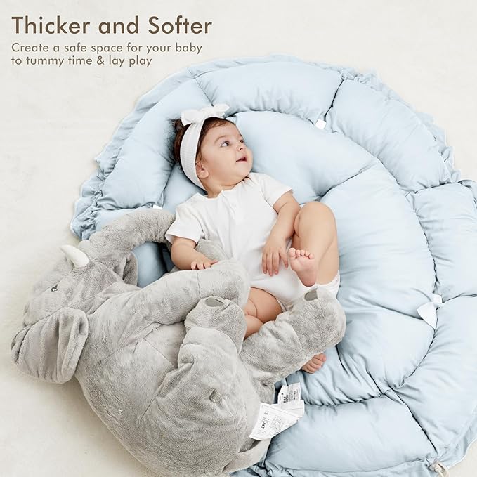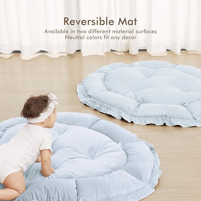 THICKER & SOFTER: The reversible play mat crafted from premium plush material, offers a fantastic amount of cushion. Its neutral color scheme blends in with your home’s aesthetic so you can keep it out even after playtime is over.