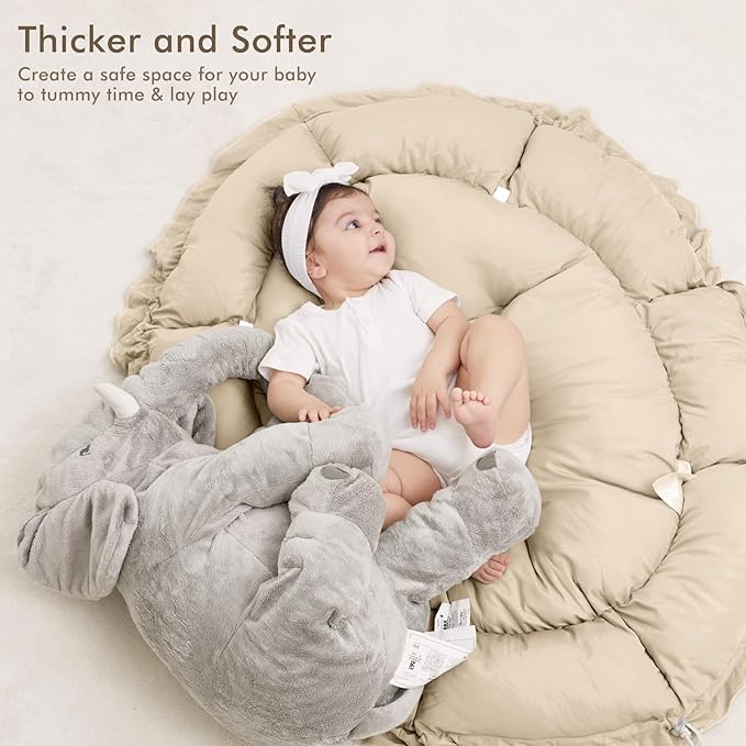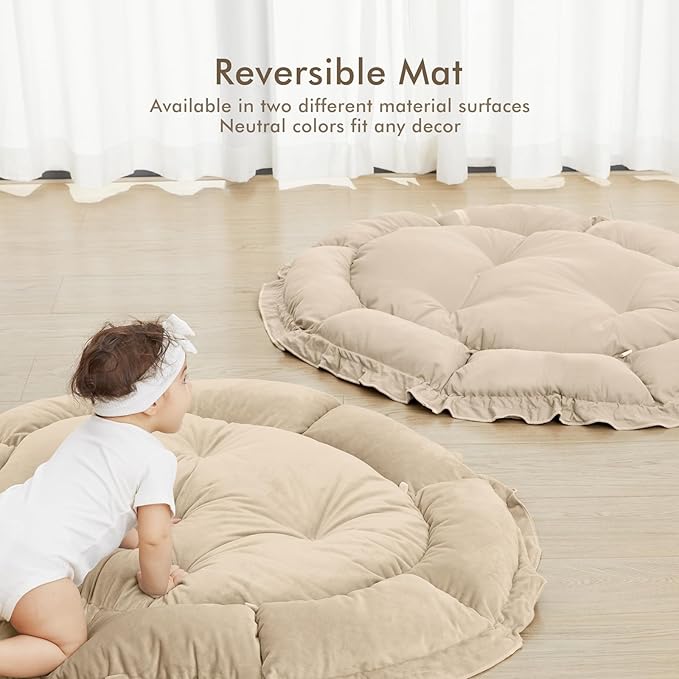 THICKER & SOFTER: The reversible play mat crafted from premium plush material, offers a fantastic amount of cushion. Its neutral color scheme blends in with your home’s aesthetic so you can keep it out even after playtime is over.