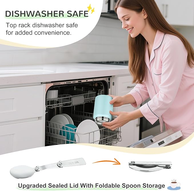- EASY-FILL WIDE MOUTH & CLEVER ACCESSORIES - kids lunch box features a 2.75-inch opening for easy scooping, serving, and dishwasher top cleaning. Hidden grip handle on the lid for safe carrying. Stainless steel folding spoon for easy storage. Non-slip base to prevent slipping.