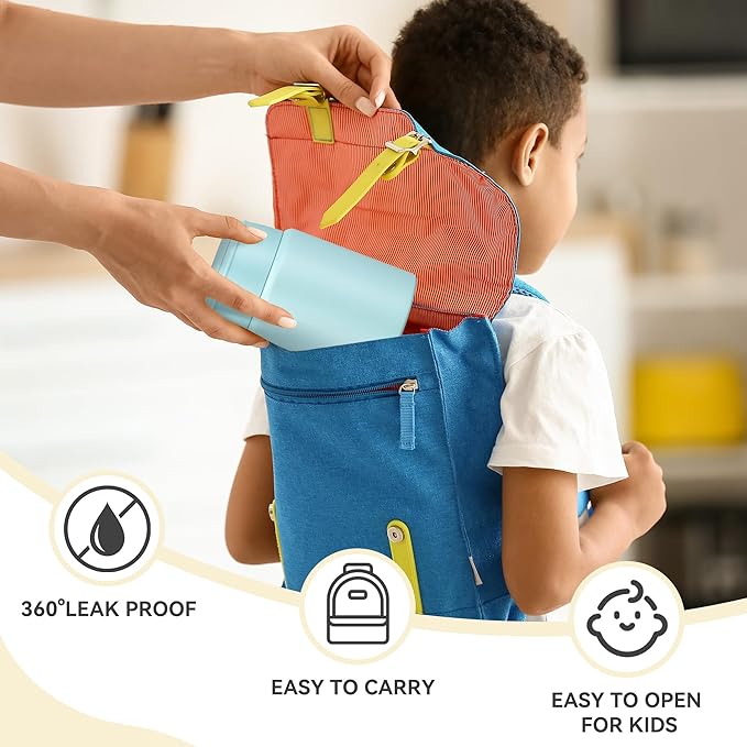 - FOOD-GRADE SAFETY & CPC CERTIFIED - The inside of kids thermo food container is made of high quality 316 stainless steel. Fully compliant with CPC standards to ensure child safe material. Double-layer vacuum insulation design, open lid venting for safe steam release. Durable, care for children's health.