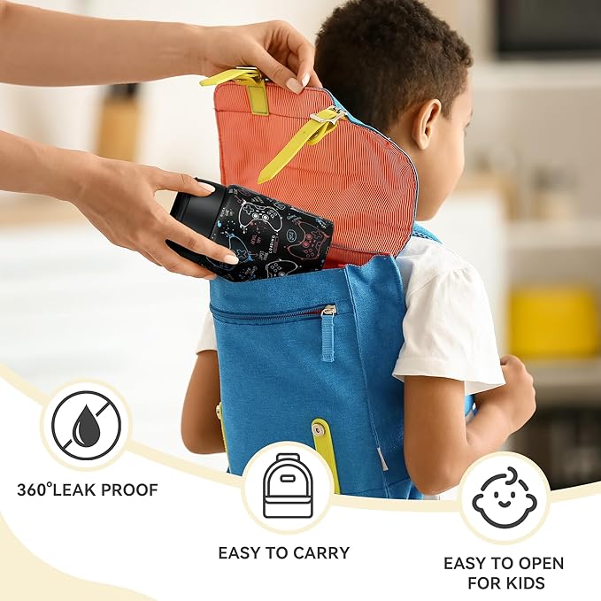 - KID-LOVED DESIGNS & HASSLE-FREE USE - Chooseβsleek solids (Black, Ice Blue, Lilac, Pink) or fun prints (Game Console, Dinosaurs, Unicorns, Rainbow). Simple screw lockβallows easy adult-assisted opening. Officially recommended for ages 3+. Easy to enjoy a healthy lunch!