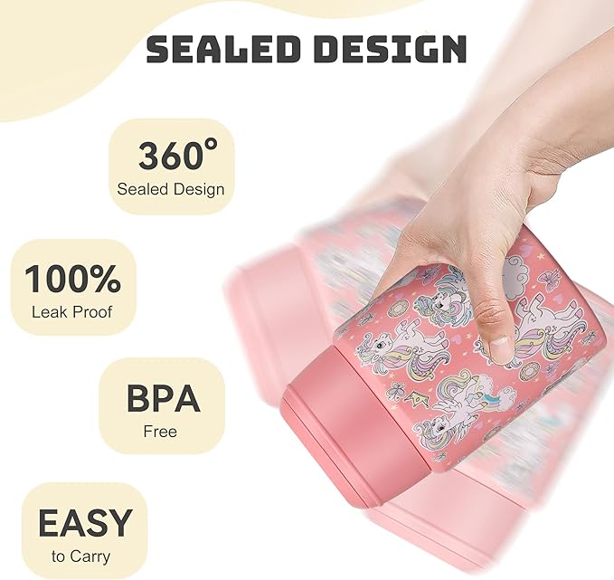 - KID-LOVED DESIGNS & HASSLE-FREE USE - Chooseβsleek solids (Black, Ice Blue, Lilac, Pink) or fun prints (Game Console, Dinosaurs, Unicorns, Rainbow). Simple screw lockβallows easy adult-assisted opening. Officially recommended for ages 3+. Easy to enjoy a healthy lunch!
