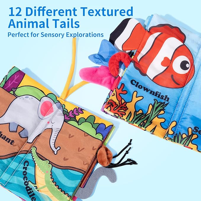 - Textured Tails for Tactile Discovery: Each page features whimsical 3D tails with varied textures, making this baby crinkle book a sensory toy for tiny hands. From tactile exploration to teething relief, these cloth books for babies naturally boost motor skills and cognitive growth.