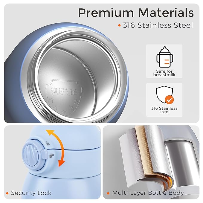- Safe Materials & Mom-Friendly Design: Crafted from food-grade silicone accessories and 316 stainless steel. The secure safety lock and leak-proof plug prevent spills, ensuring peace of mind during travel. The inner wall of the bottle features clear measurement markings, making it easy to pour and track the amount of milk added. This portable baby bottle warmer includes a sponge brush to make cleaning effortless, helping you keep the bottle clean with ease