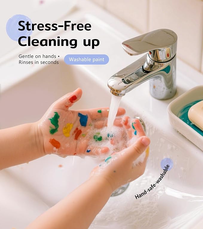 - SUPER EASY TO CLEAN – NO STAINS: Worried about mess? Our washable paint for kids washes off effortlessly from skin, clothes, and surfaces with just soap and water. Unlike traditional paint, this safe, non-toxic formula makes cleanup stress-free, so kids can enjoy finger paint . A classroom must haves for teachers who need hassle-free art supplies
