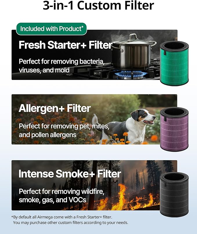 - PERSONALIZED AIR CARE Tailor your air purification experience to your needs with a custom 3-in-1 filter. Fresh Starterplus for unwanted VOCs, and odors. Allergenplus for pollen, dust mites, fungi, and pet dander. Intense Smokeplus for wildfires, pollution and industrial fumes.