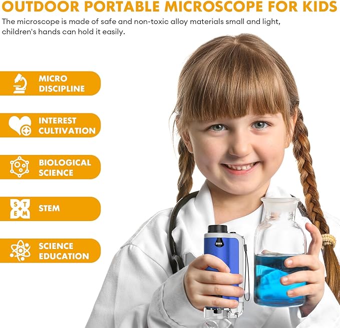 - Compact & Travel-Friendly: Designed with portability in mind, this lightweight and compact microscope is easy for kids to carry and use anywhere—whether at school, on nature walks, or during travel. Ideal for both indoor and outdoor exploration.