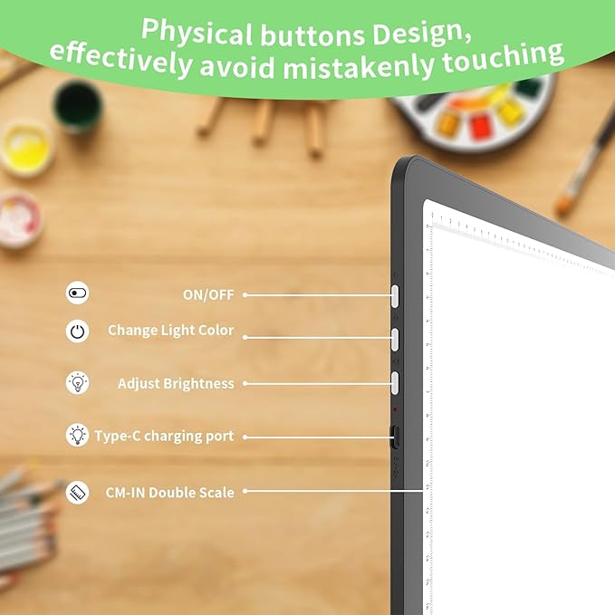 - [Dual Measurement System & Spacious A3 Workspace]: CM/INCH dual scales adapt to global crafting standards.The size of tracing light box is 18.2 x 13.4 in (46.2 x 33.9 cm). Generous 16.8 x 12 in (42.6 x 30.5 cm) illuminated area fits A3 paper, diamond painting kits, and tattoo stencils. Ultra-slim 0.3 in (0.8 cm) profile slips into portfolios. Note: Surface is scratch-resistant but avoid sharp tools