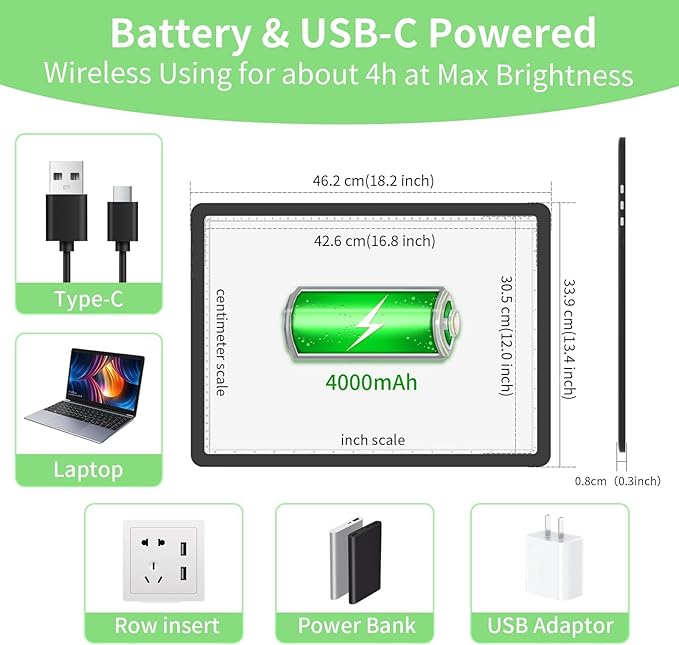 - [Long-Lasting 4000mAh Battery & Fast USB-C Charging]: Portable A3 light table with 4+ hours runtime at max brightness (8+ hours at medium). Recharge via universal USB-C in 3.5 hours – compatible with laptops, power banks, and car chargers. No more cable clutter! Stable USB-C port outperforms fragile micro-USB, ideal for on-the-go crafting