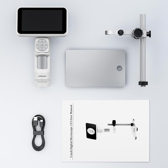 - 【What You Can Get】 5-inch IPS Handheld Microscope AD115, Metal Base, Column, USB-C Cable, User Manual, and 24-hour professional after-sales service.