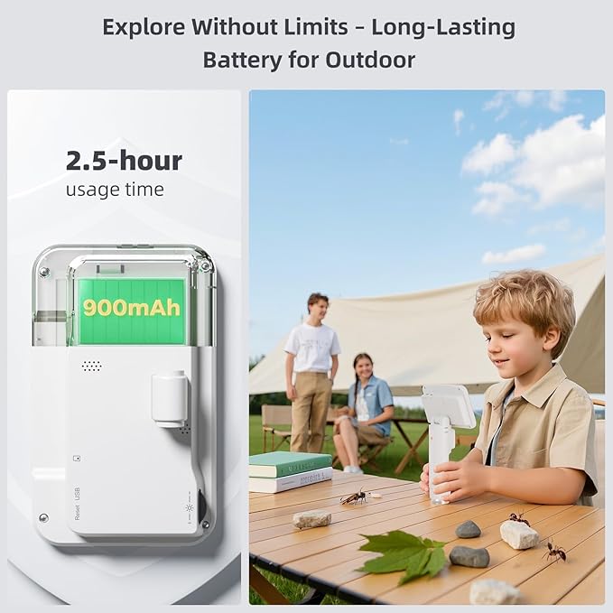 - 【Ultimate Kids' Exploration Microscope】Built for young adventurers with a long-lasting 900mAh battery (2.5 hours of continuous use), this durable, lightweight microscope empowers kids to discover nature's wonders outdoors—from backyard to classroom—without interruption, featuring simple one-touch operation and drop-resistant construction for worry-free STEM learning.