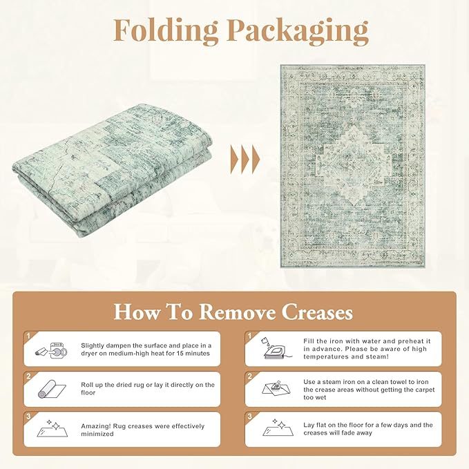 - Folding Packaging--Due to the folding during packaging, the sage green rug may have some creases upon opening. However, the edges are resistant to buckling, and the folds will disappear once the rug is laid flat and ironed.